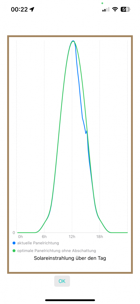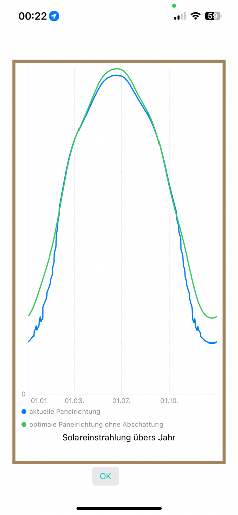 Aus diesen Daten wir der Ertrag der Solarpanels ermittelt und als Prozentwert von einem ideal ausgerichteten Solarpanels ohne Abschattung angezeigt.
