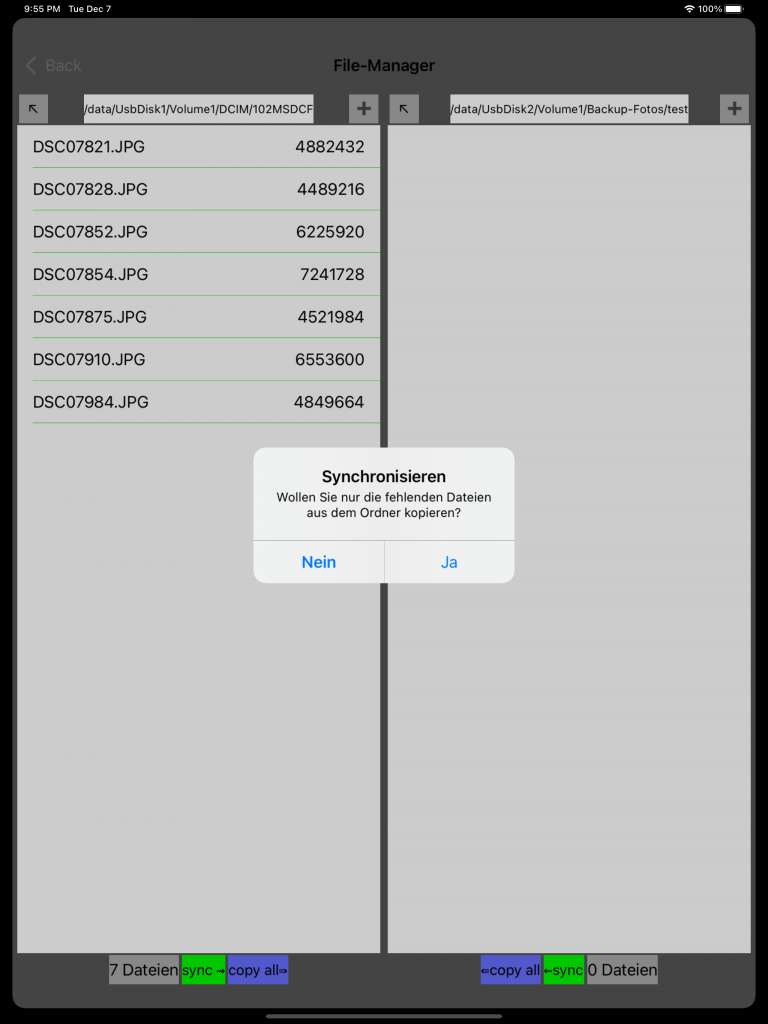 – Synchronisieren: es werden nur die Dateien kopiert, die im Zielordner noch nicht vorhanden sind. -> Diese Methode ist viel schneller, wenn nur wenige Dateien neu sind. Außerdem kann der Fortschritt anhand eines Balkens verfolgt werden.